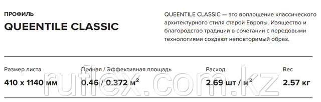 QUEENTILE Classic — дизайн, воплотивший идеи классического архитектурного стиля Северной Европы. Высота профиля 50 мм. Характеризуется более выразительным видом на крыше по сравнению с аналогами (глубина изгиба 24 мм). Увеличена жесткость листа.