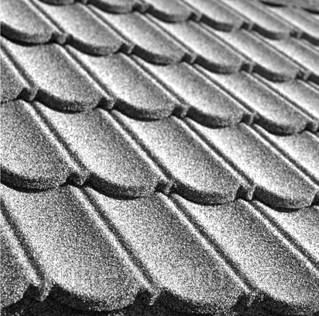 Поверхность черепицы покрыта гранулами натурального камня. Монолитное соединение каменных гранул с поверхностью металла обеспечивает уникальный связующий компонент на основе акрила.